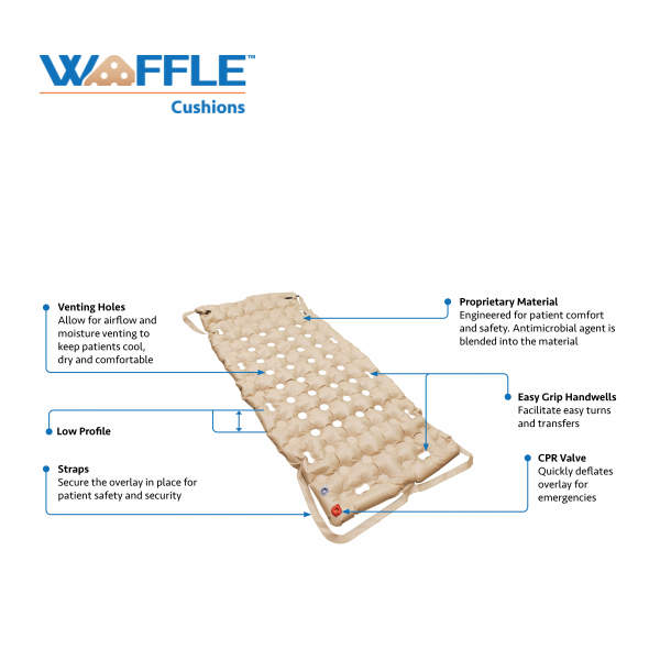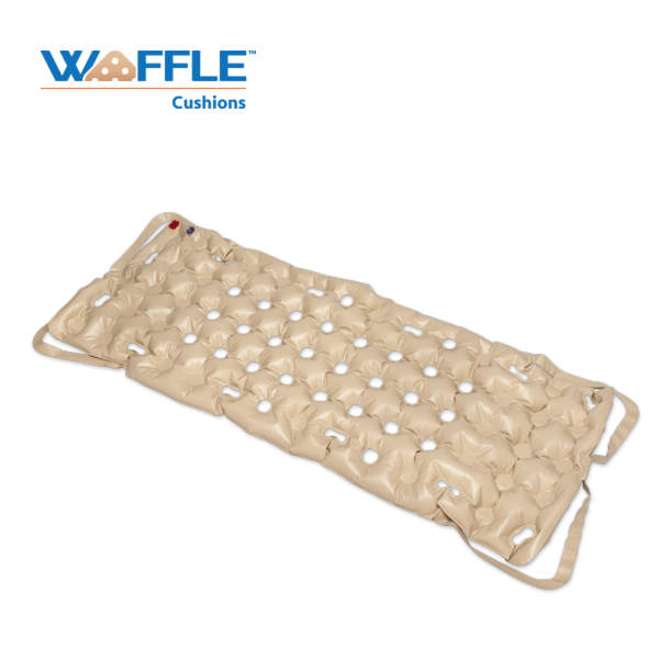 מזרן WAFFLE® מיועד להנחה על גבי המזרן הקיים שלך. האוויר מערסל את הגוף ומספק הגנה וטיפול בפצעי לחץ. כמו כן, הוא מומלץ לטיפול גם בכאבים. עיצוב פטנט מבטיח שאוויר תמיד יקיף את גופו של המטופל.