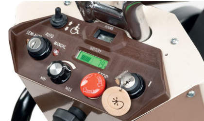 מפתח הצתה, לחצן חירום, בקר מהירות, מחוון סוללה, מונה זמני פעולה, בורר מפתח ובורר נטייה לחיבור לכסא גלגלים.