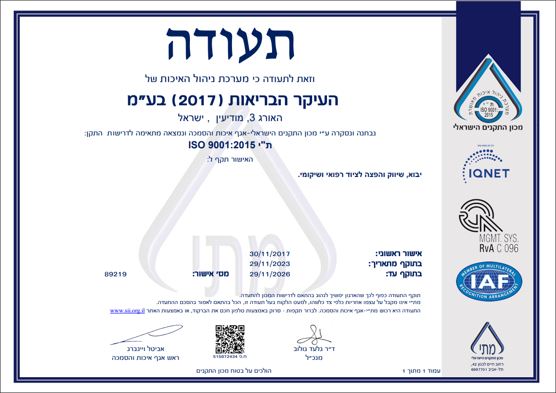 חברת העיקר הבריאות בעלת תעודת iso 9001 של מכון התקנים.